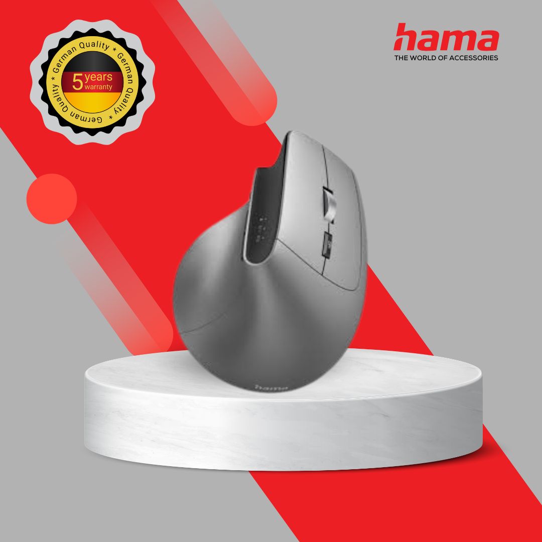 The Hama EMW-700 vertical mouse perfectly rises to ergonomic challenges and enables easy switching between internet pages with its practical browser buttons. When using multiple end devices, you can easily switch between the three devices with the push of a button.